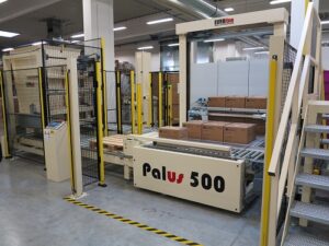 Das Projekt für unseren Kunden aus der pharmazeutischen Industrie umfasst die Konzeption, Planung und Realisierung einer Lösung für die Palettierung von verschiedenen pharmazeutischen Flüssigkeiten abgefüllt in sterile Verpackungen. Zum Einsatz für die Palettierung kommen unsere Palus 500 Lagenpalettierer mit automatischer Lagenbild- und Leistungsanpassung an unterschiedliche Produktionsaufträge, verschiedene Fördertechnikkomponenten sowie ein neuer Palettenwickler. Die Verkettung mit vorhandener Fördertechnik, Palettenwickler und Systemen für die Palettierung sowie die Vernetzung der Produktionslinien gehört ebenfalls zum Projektumfang.