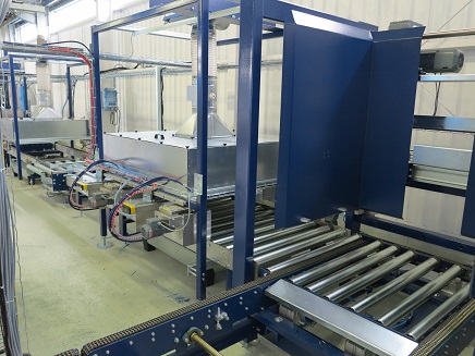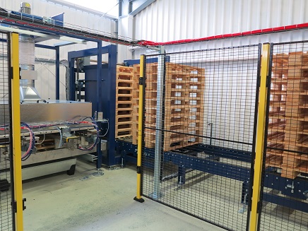 Die Anlage bietet eine Aufgabestation für die Aufgabe von Palettenstapeln mit bis zu 20 Paletten mittels Gabelstapler. Nachfolgend sind einige Pufferplätze integriert. Das folgende automatische Palettenmagazin entstapelt und vereinzelt die Paletten. Die Paletten werden dann über Kettenbahnen, Drehstationen und Rollenförderern nacheinander durch die erste Lackierstation für die Färbung der Längsseite, danach durch die zweite Lackierstation (Färbung der Querseite) und zuletzt durch die dritte Lackierstation zum Aufbringen des Kunden-Logos mittels Sprüh-Schablone transportiert.