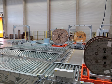 Das Projekt umfasst die intelligente Zu- und Abführung von Kabeltrommeln mit bis zu 3 to. Gewicht für drei automatische Kabelwickelanlagen für die Kommissionierung von Kabelzuschnitten im Elektrogroßhandel.