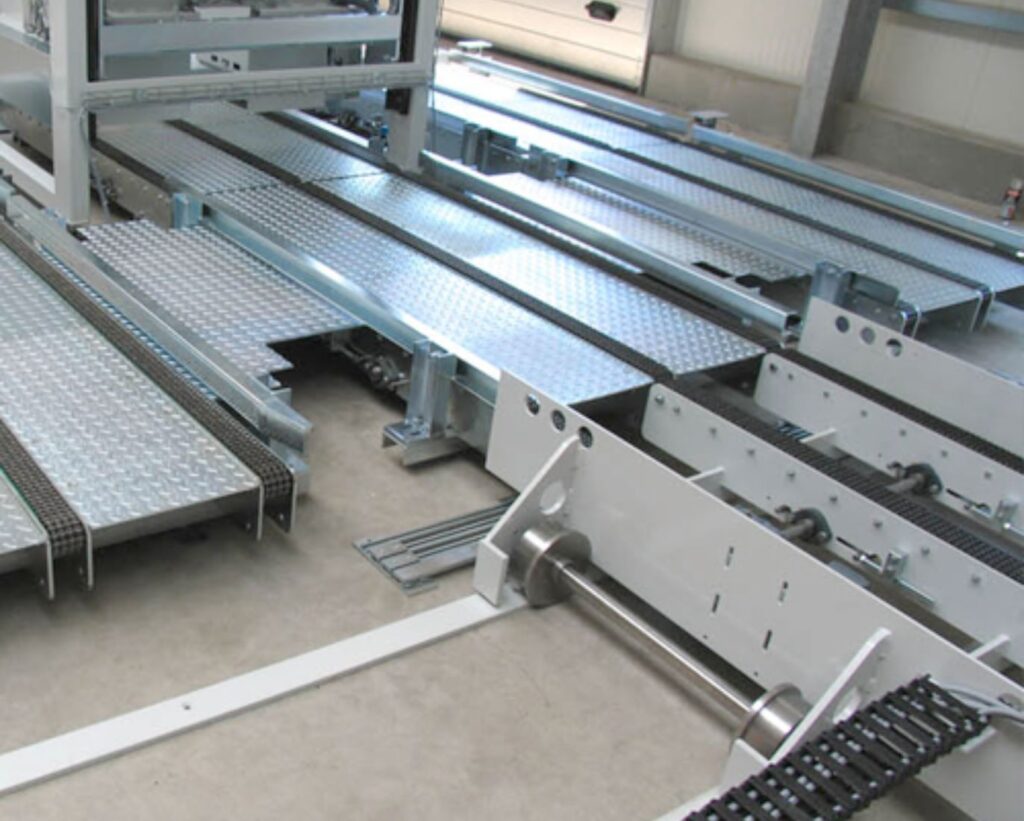 In unserer Palettiertechnik setzen wir zum Eintakten der Produkte und zur Formierung der Lagenbilder in der Palettieranlage entweder Gliederbänder mit präziser Servoantriebstechnik ohne zusätzliche Stopper oder Sperren ein um verschiedenste Lagenbilder bei hoher Taktzahl zu erzeugen. Dies bietet den Vorteil einer größtmöglichen Flexibilität bei der Lagenformierung.